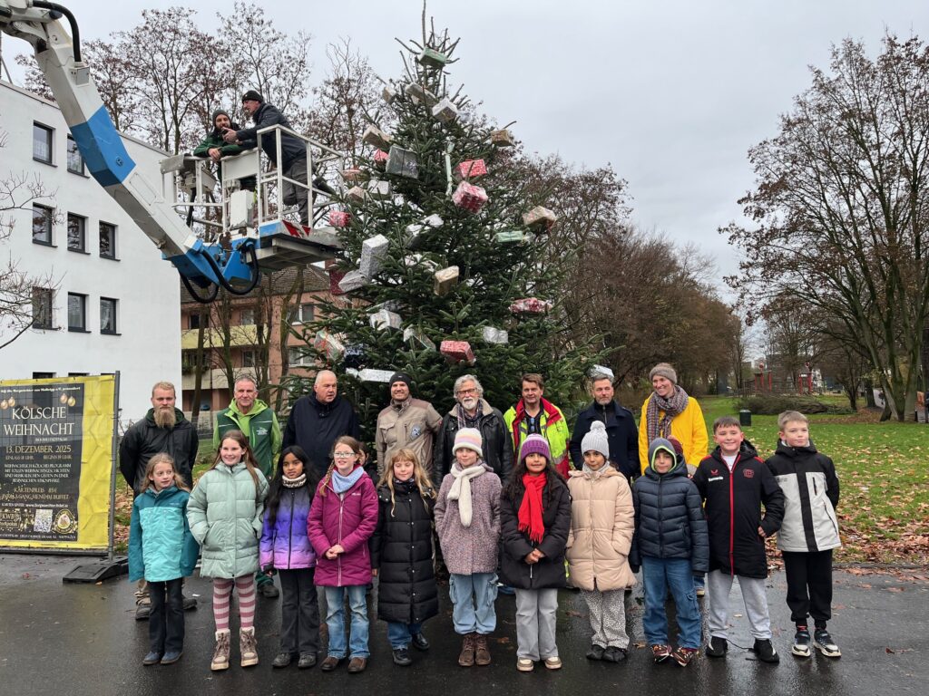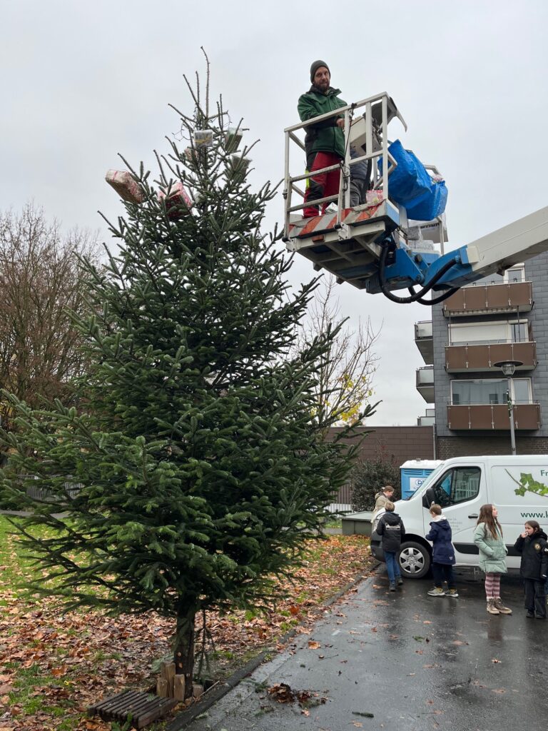 Der Weihnachtsbaum wurde gefällt, nach Holweide transportiert, auf dem Marktplatz aufgebaut